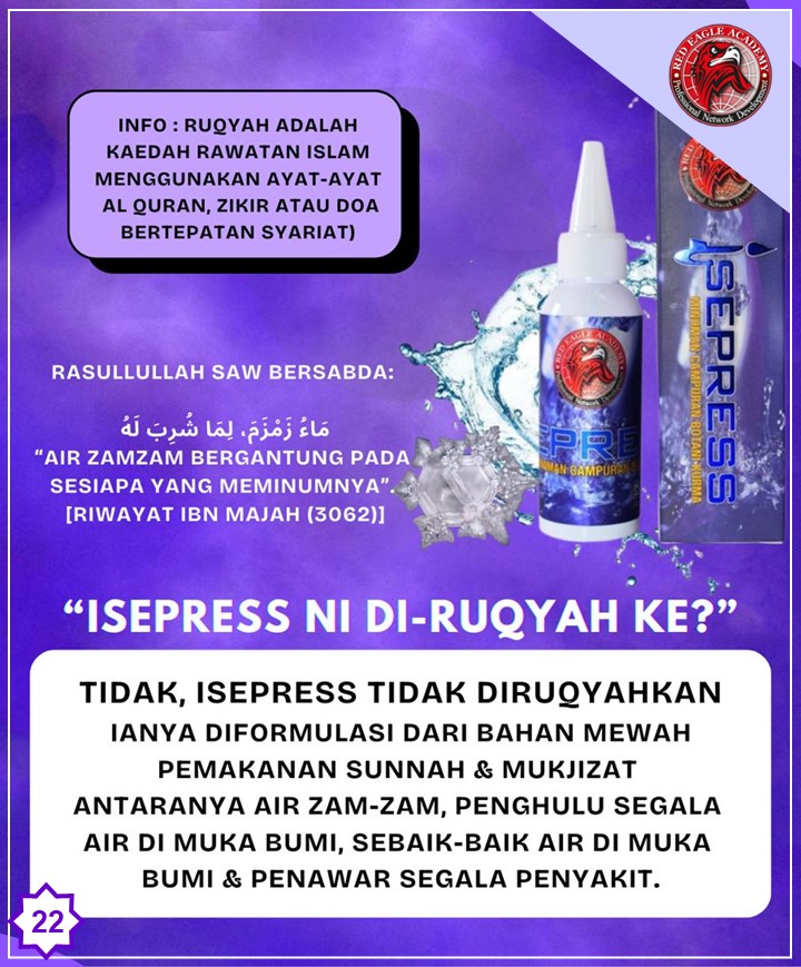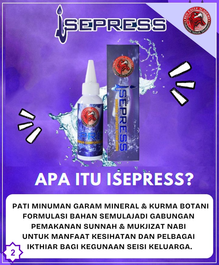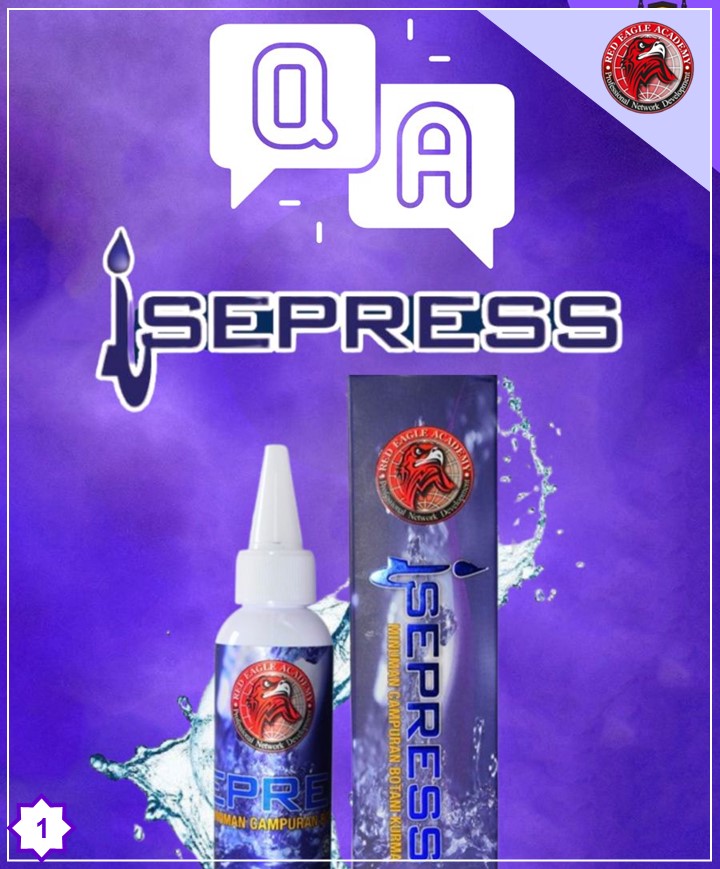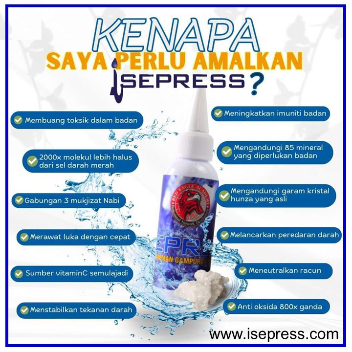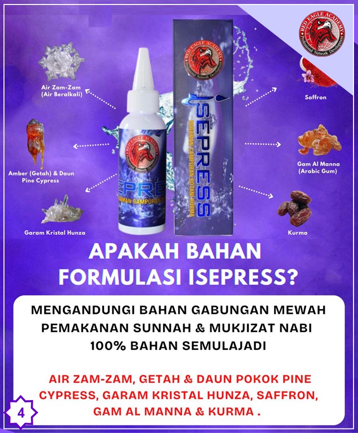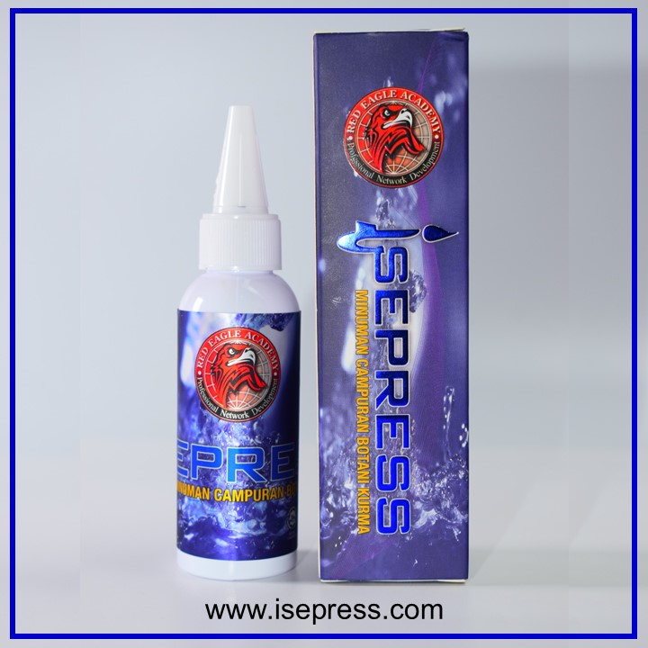 ISEPRESS ADALAH MINUMAN KESIHATAN. SEBOTOL ISEPRESS MENGANDUNGI 50ML CECAIR. KANDUNGAN UTAMA ISEPRESS ADALAH FORMULASI 100% BAHAN SEMULA JADI IAITU GABUNGAN MAKANAN SUNNAH AIR ZAMZAM, GARAM KRISTAL HUNZA, AMBER PINE CYPRESS, EKSTRAK KURMA, SAFRON DAN GAM ARABIC.